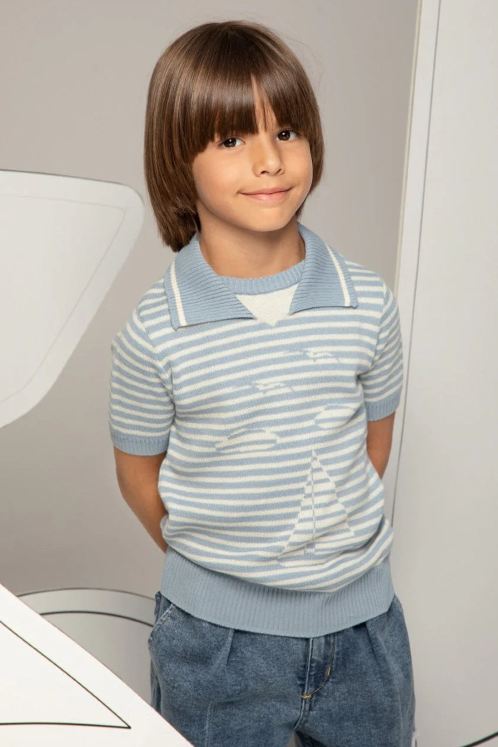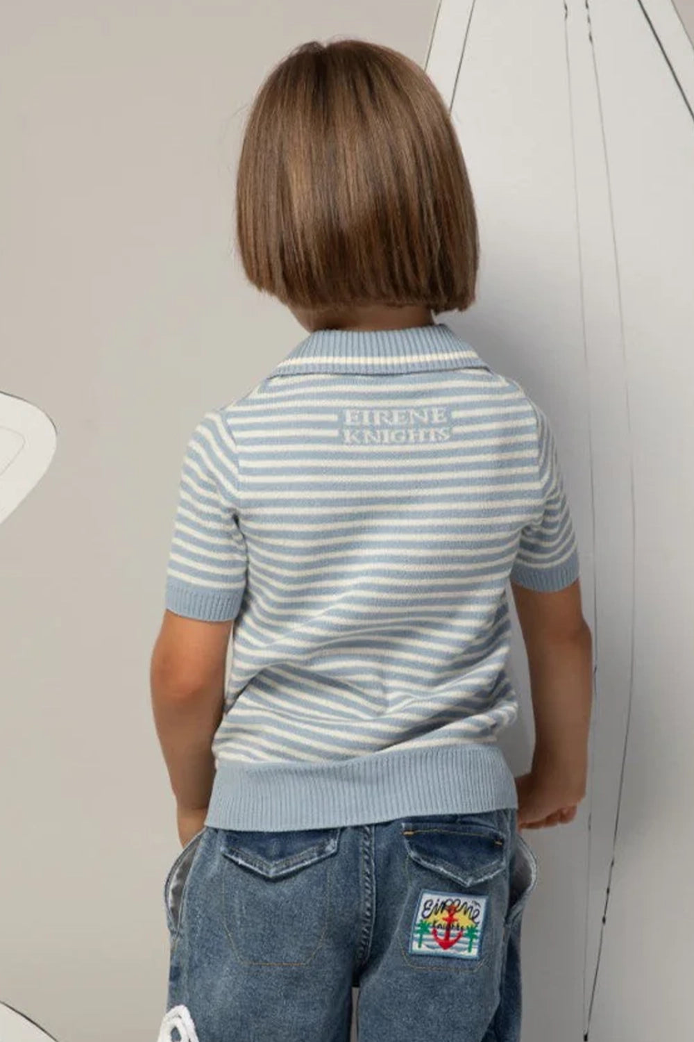 Light blue and white striped knit shirt with a sailor collar and short sleeves