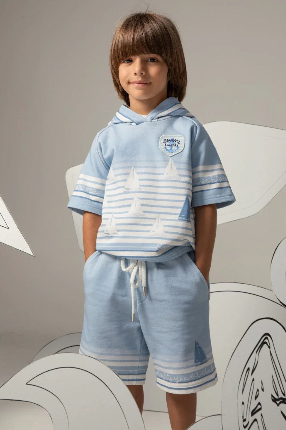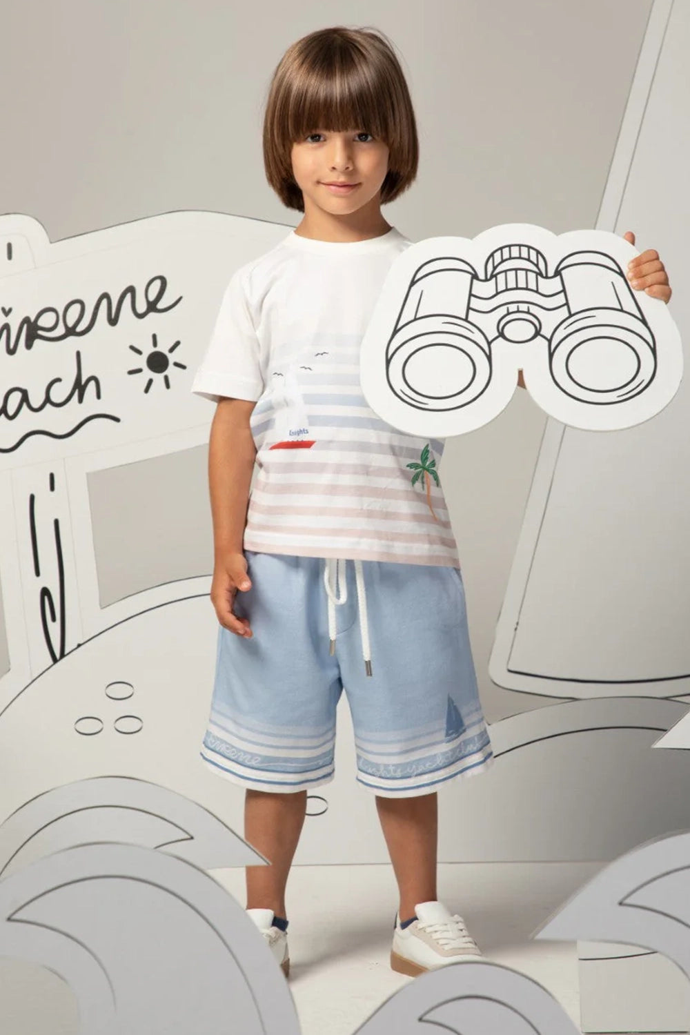These charming light blue shorts feature a spirited striped print, crafted from breathable cotton.