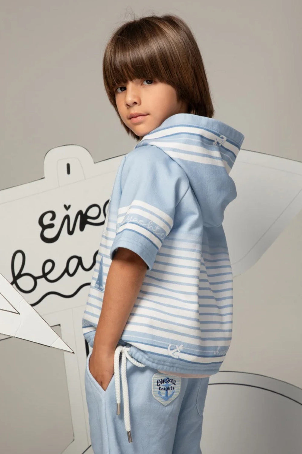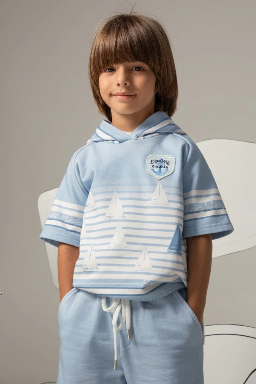 Light blue short-sleeved striped hoodie with sailboat print and Eirene Knights patch