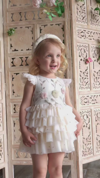 هذا الفستان الرقيق للأطفال مصنوع من التول الأبيض العاجي الناعم، ومصمم بأكمام منفوخة رقيقة لإطلالة أنيقة خالدة. الجزء العلوي مزين بتطريزات زهرية ثلاثية الأبعاد مطرزة يدويًا، مما يضفي عليه ملمسًا مميزًا وجمالًا ساحرًا.