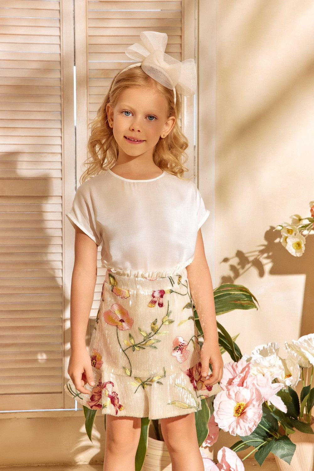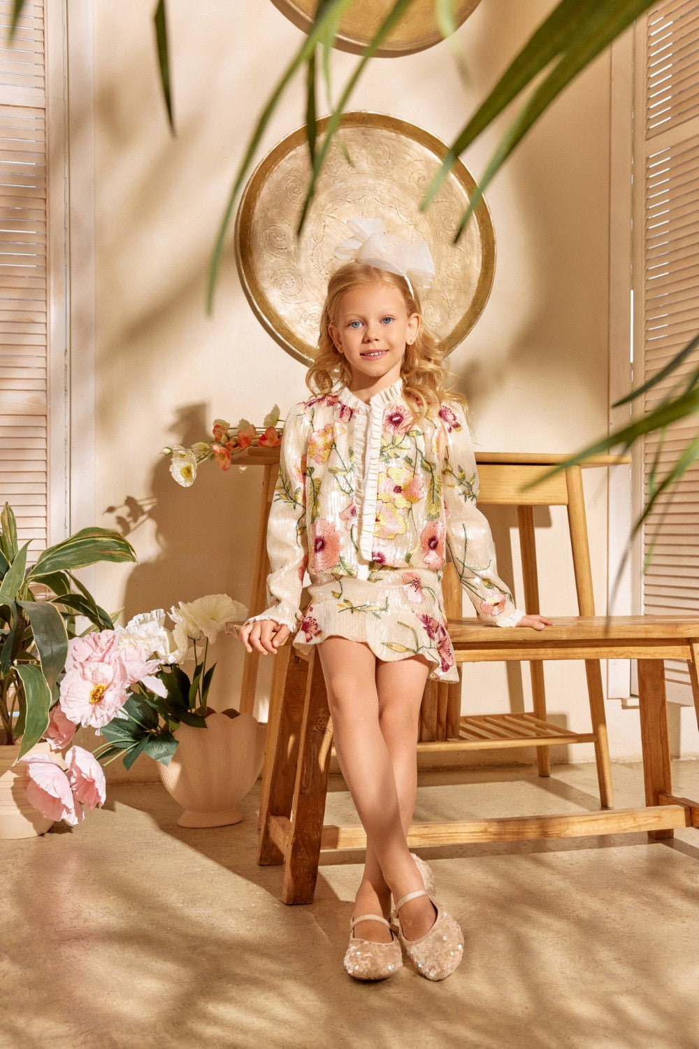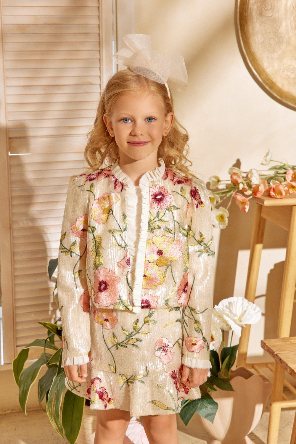 Ivory sequin set featurting a floral embroidered jacket with pleated trim and a matching mini skirt with frill