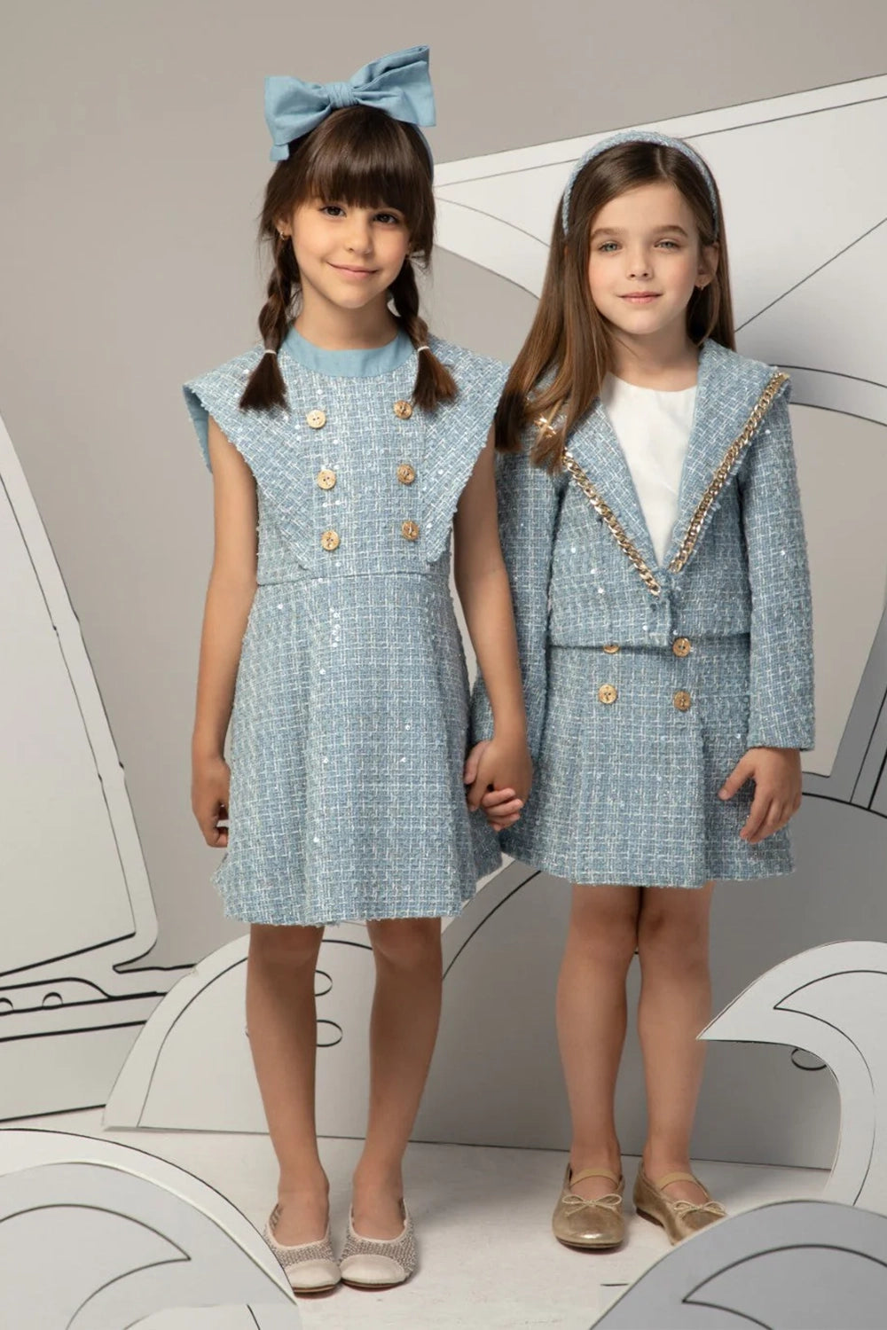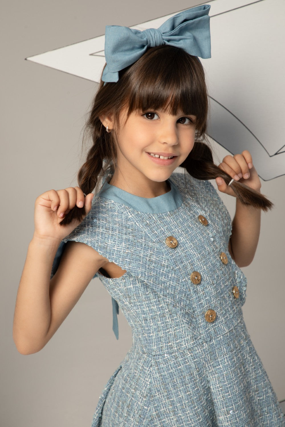 This light blue tweed dress captures a sense of sophisticated charm, perfect for your little one's special moments.