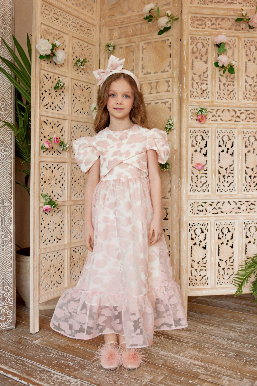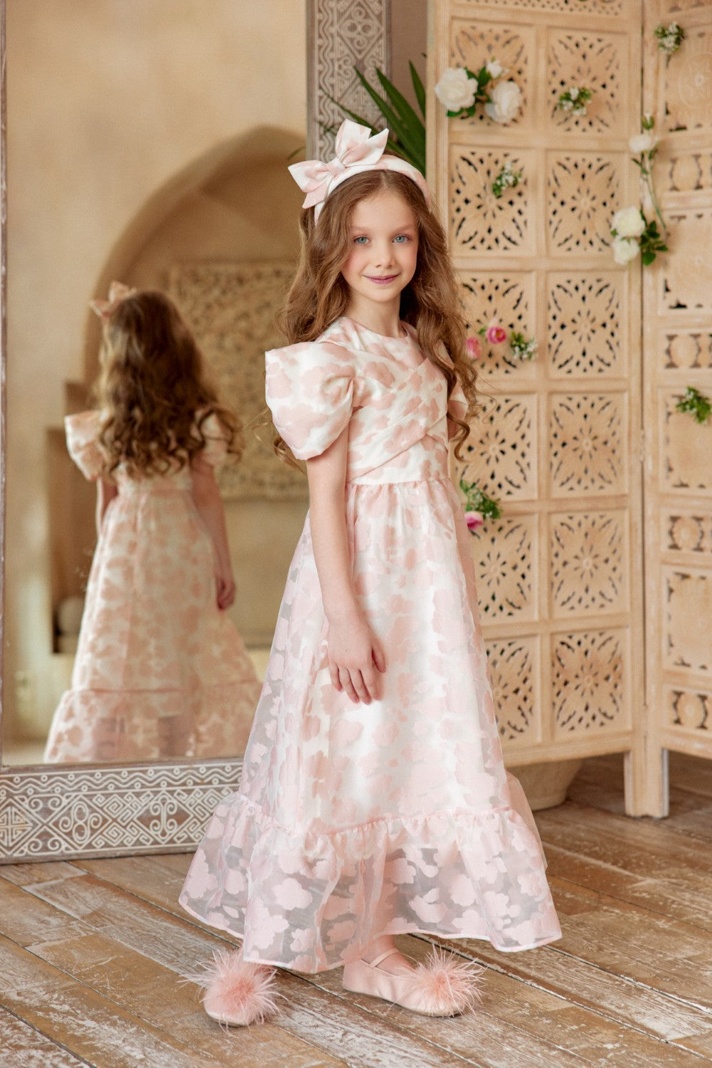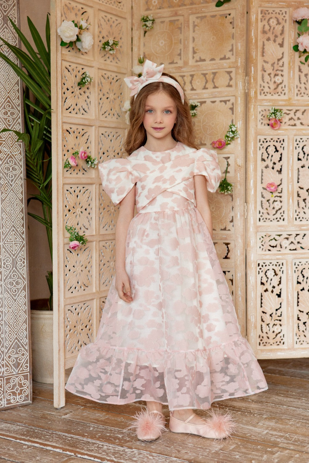 This long blush pink organza dress exudes pure charm, perfect for your little one's special moments.