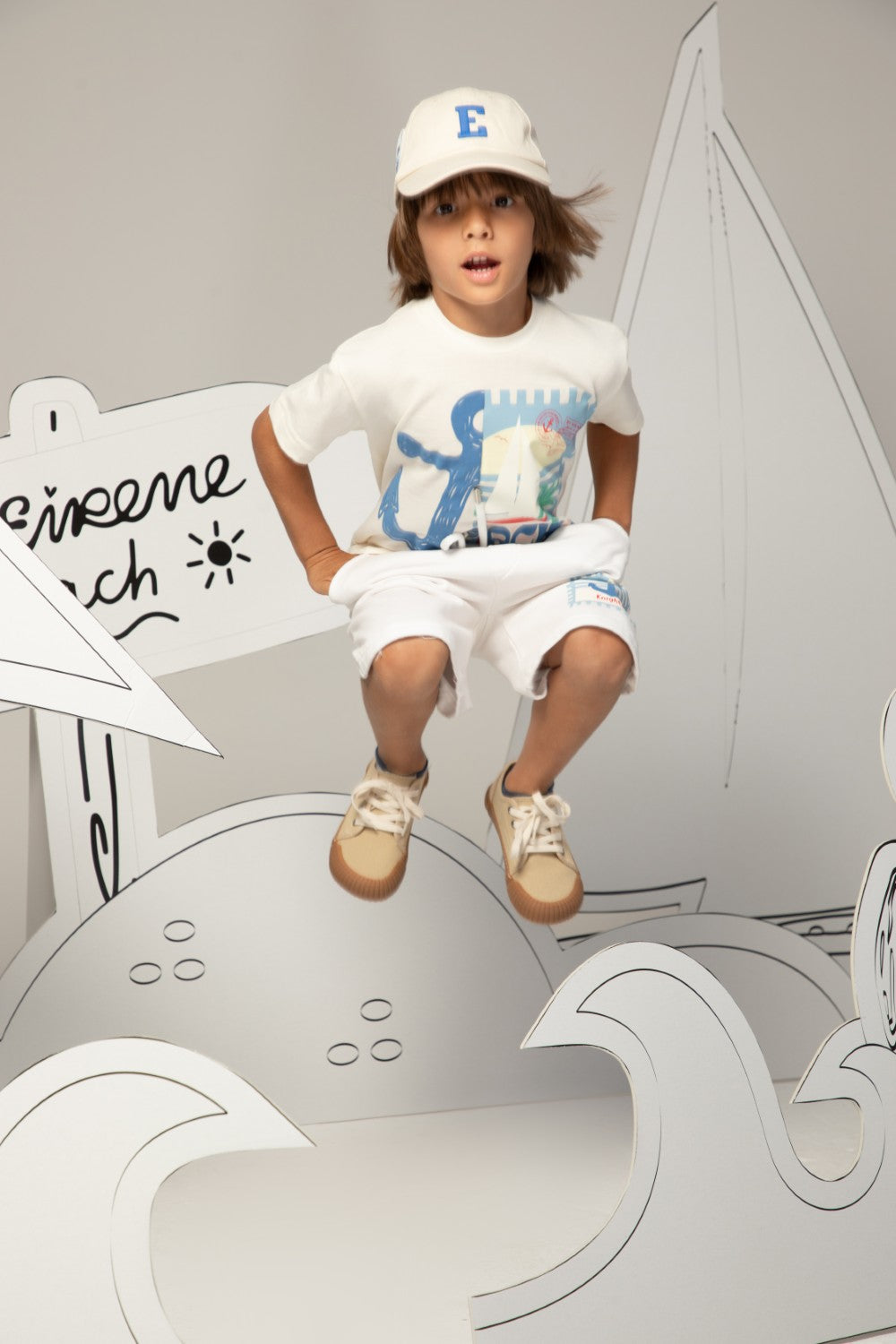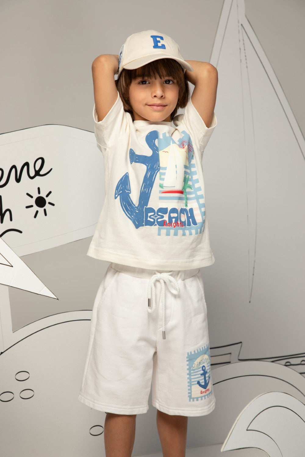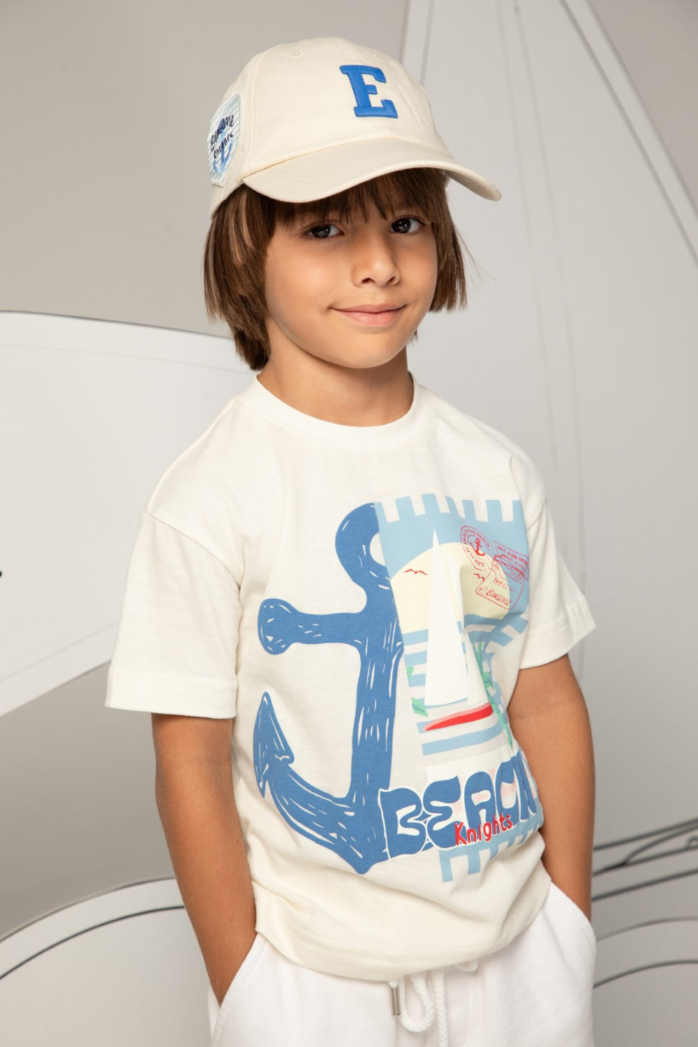 Capture the charm of summer with this off-white cotton T-shirt featuring a unique anchor and postcard print.