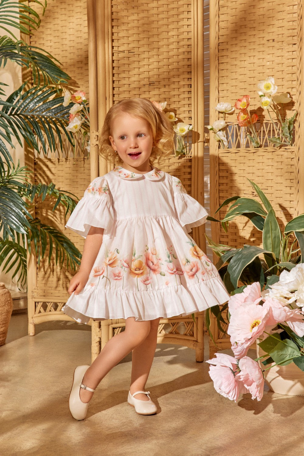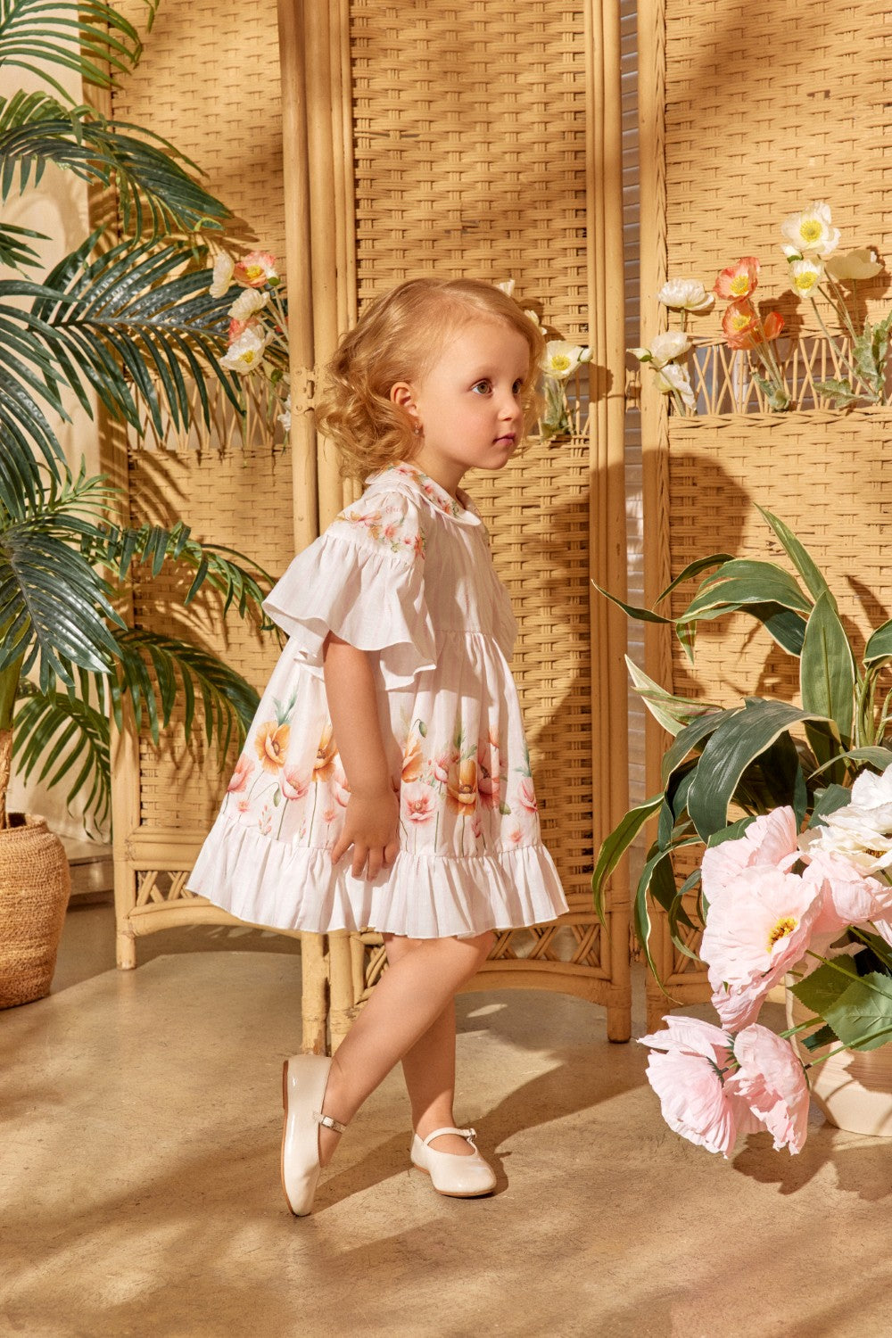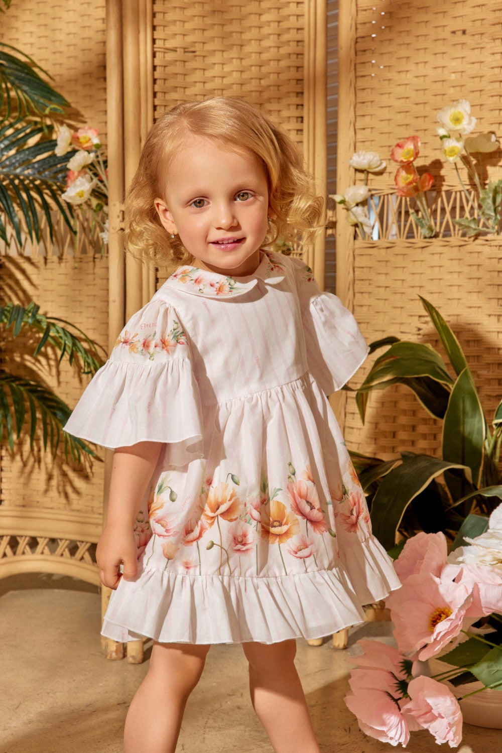 This charming soft pink cotton dress features delicate stripes and a cheerful floral print, exuding youthful elegance.