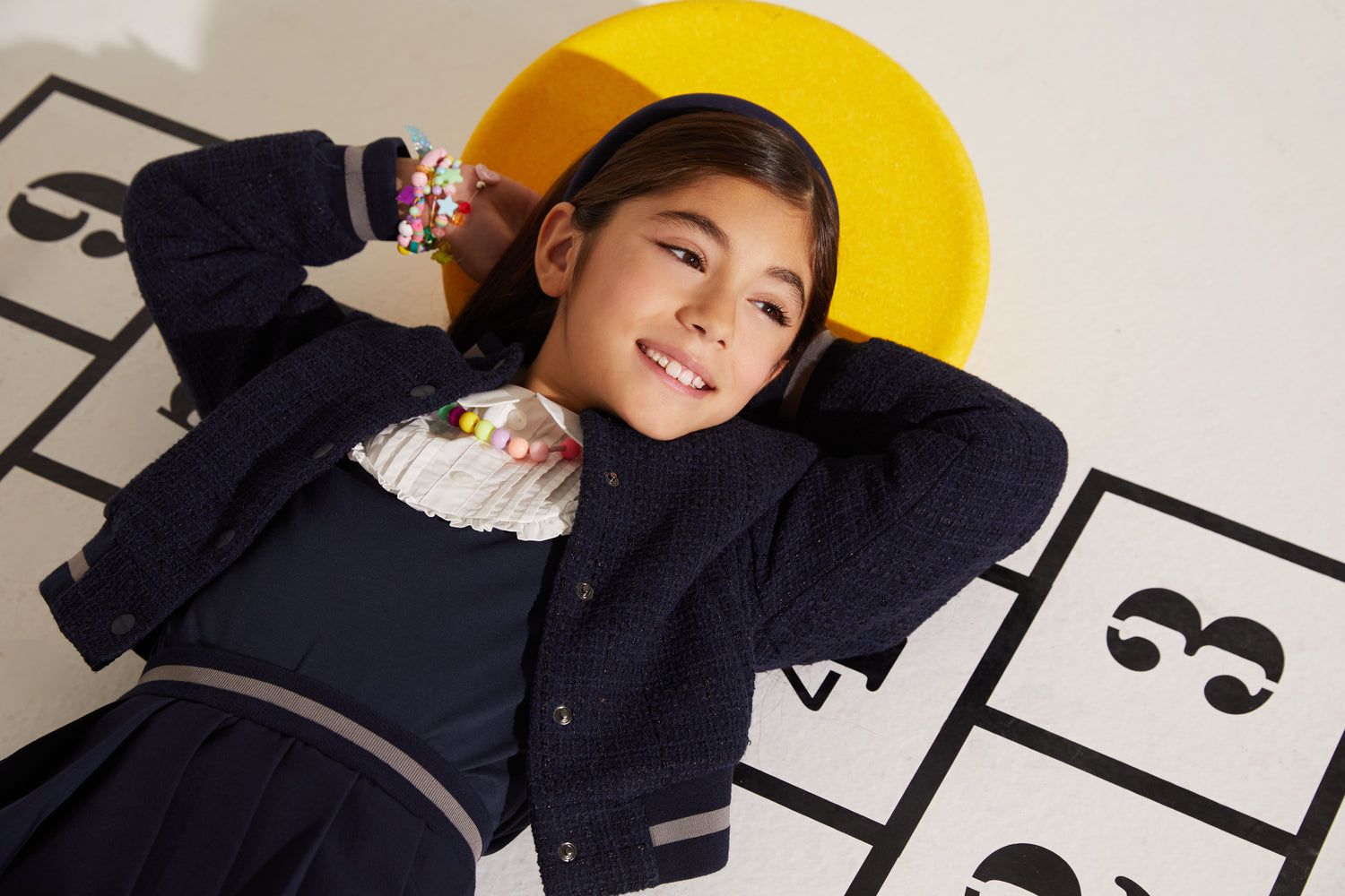 Ribbed cuffs, collar, and hem add a sporty touch, while subtle detailing and premium finishes reflect the signature craftsmanship of our luxury house. Ideal for layering over smart separates or casual knits, this piece brings effortless elegance to every school day.
