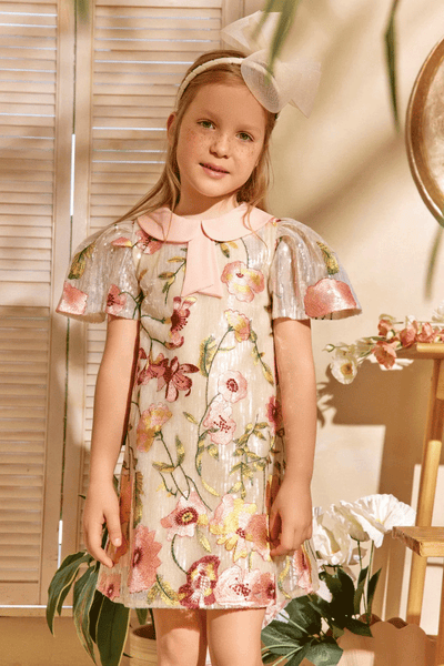 A vibrant and eye-catching dress adorned with a beautiful floral pattern in a mix of bold and pastel hues. The design features a lively arrangement of blossoms, creating a fresh and feminine look. The floral girls dress has short puff sleeves, buttons at the top and a long length. Made from lightweight fabric, this dress offers both comfort and elegance, making it perfect for sunny days, garden parties, or any cheerful occasion. Add accessories and finish in style.