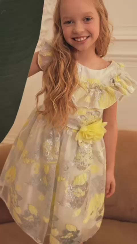A sophisticated jacquard dress featuring intricate woven patterns and elegant craftsmanship. The dress has an oval neckline decorated with delicate curls, short sleeves and length. Zipper closure at the back. Adorned with delicate yellow flower details, this dress exudes a fresh and feminine charm. The textured jacquard fabric adds a touch of luxury, while the floral accents bring a lively and cheerful contrast. Perfect for special occasions, this dress is a beautiful blend of timeless elegance and modern style.