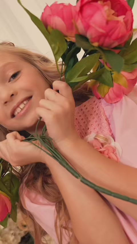 A sweet and stylish pink cotton dress for girls, designed with soft, breathable fabric for all-day comfort. The girls dress has short, light puff sleeves and an oval neckline. The model has a beautiful flower detail at the top. The pink dress fastens with a zipper at the back. This charming dress features a classic silhouette with delicate details, making it perfect for casual outings or special occasions. Its gentle pink hue adds a touch of elegance, while the lightweight material ensures ease of movement and a comfortable fit.