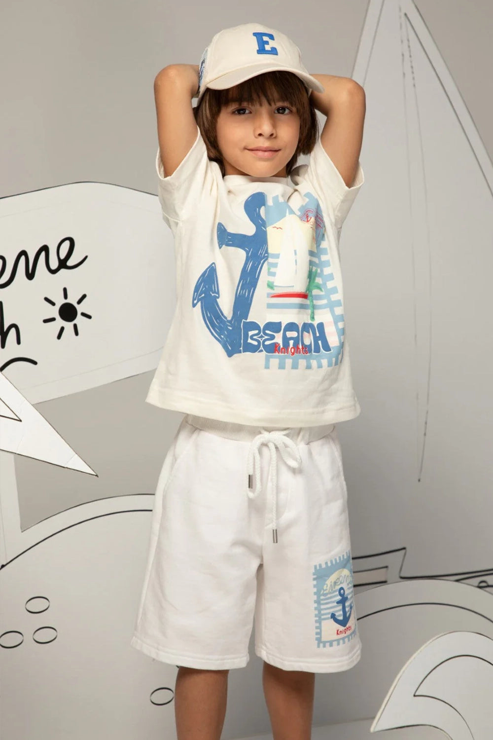 These charming off-white cotton shorts feature a delightful anchor print, perfect for adding a touch of nautical sophistication to any young adventurer's wardrobe.