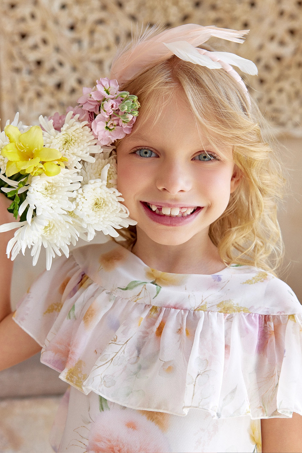 This charming white chiffon dress features an elegant flower print and distinctive cape sleeves.