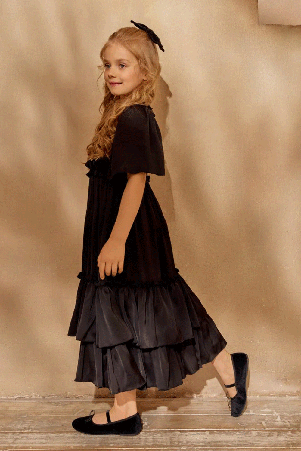 This black, long satin dress with a tiered skirt offers timeless elegance for your little one.