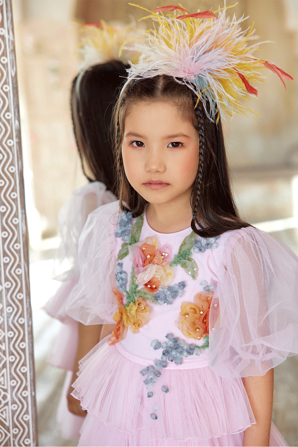 Pink tulle dress with puff sleeves and hand-embellished 3D flowers