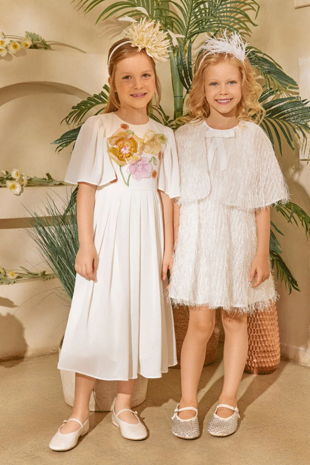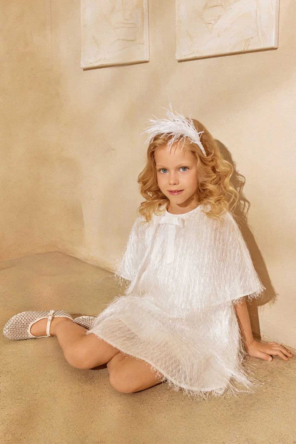 White dress with textured fringe shimmering fabric, featuring a cape-effect overlay and a bow detail