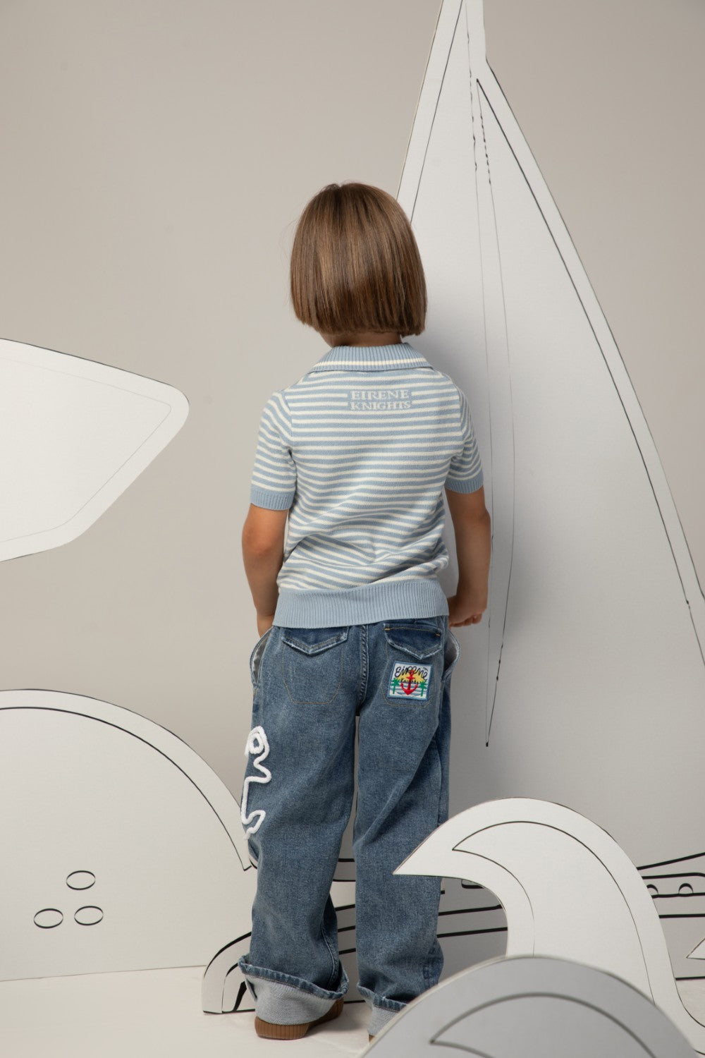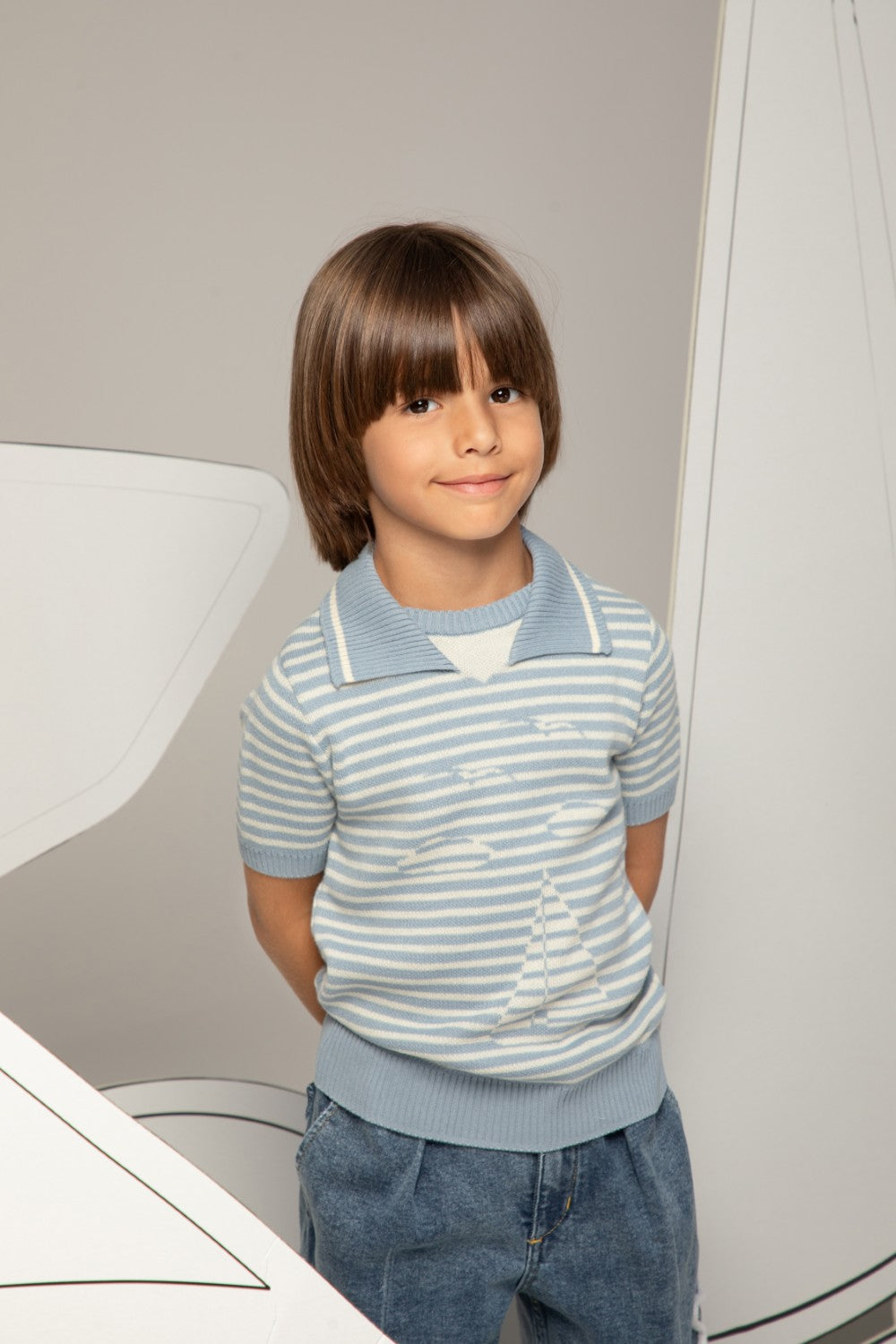 Light blue and white striped knit shirt with a sailor collar and short sleeves
